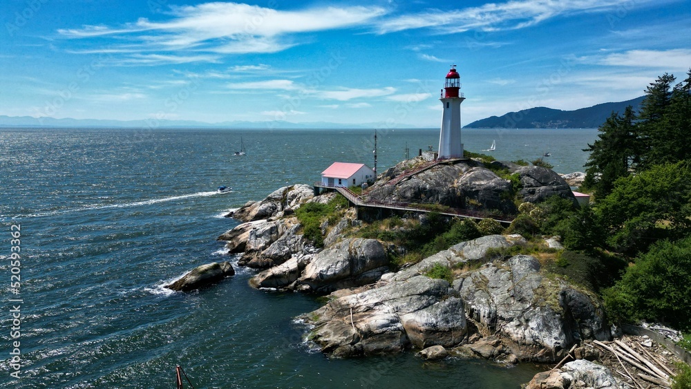 Obraz na plátně View of an old lighthouse on the rocky seashore on a sunny day