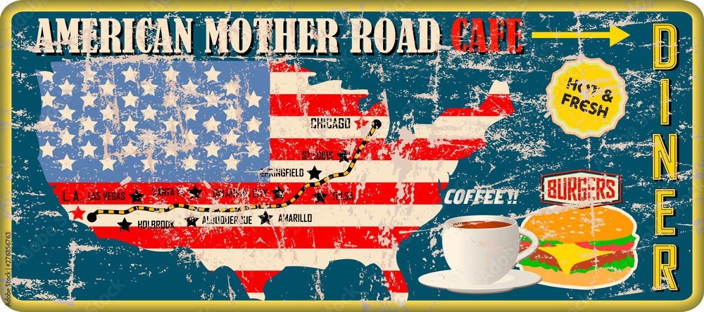 Fotografie Vintage american mother road diner and cafe sign, retro grungy vector illustrati