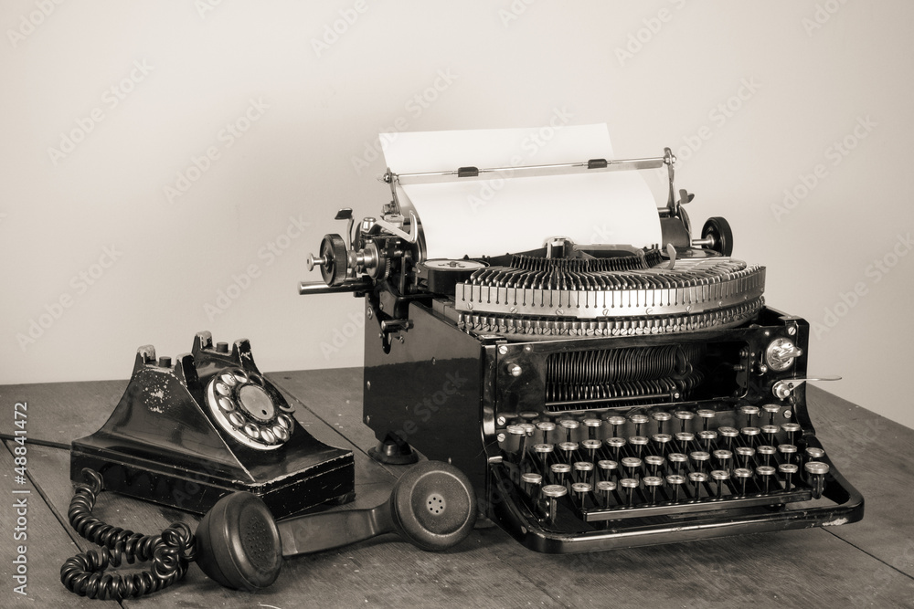 Fotografie Vintage phone, old typewriter on table desaturated photo