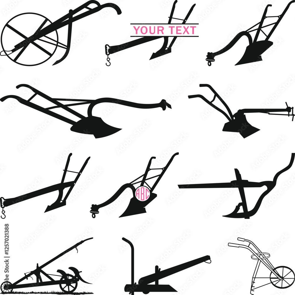 Fotografie Vintage Plows Silhouettes Collection Old Plows SVG Farming Vector Farmhouse Mono
