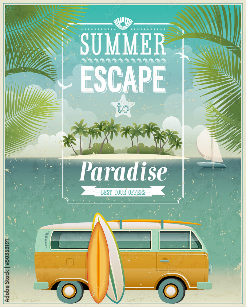 Fototapeta Vintage seaside view poster with surfing van. Vector background.