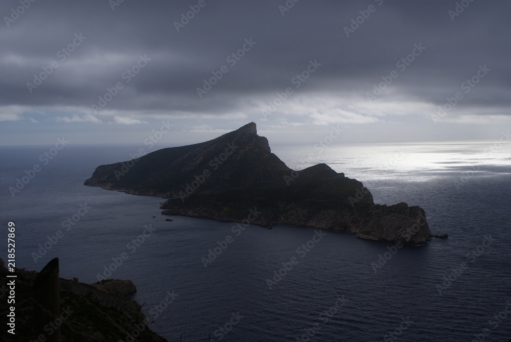 Fotografie Vistas de isla sa Dragonera desde La Trapa, Sierra de Tramuntana, Mallorca, Islas Baleares, durante día nublado de primavera con luz del sol plateada sobre mar Mediterráneo