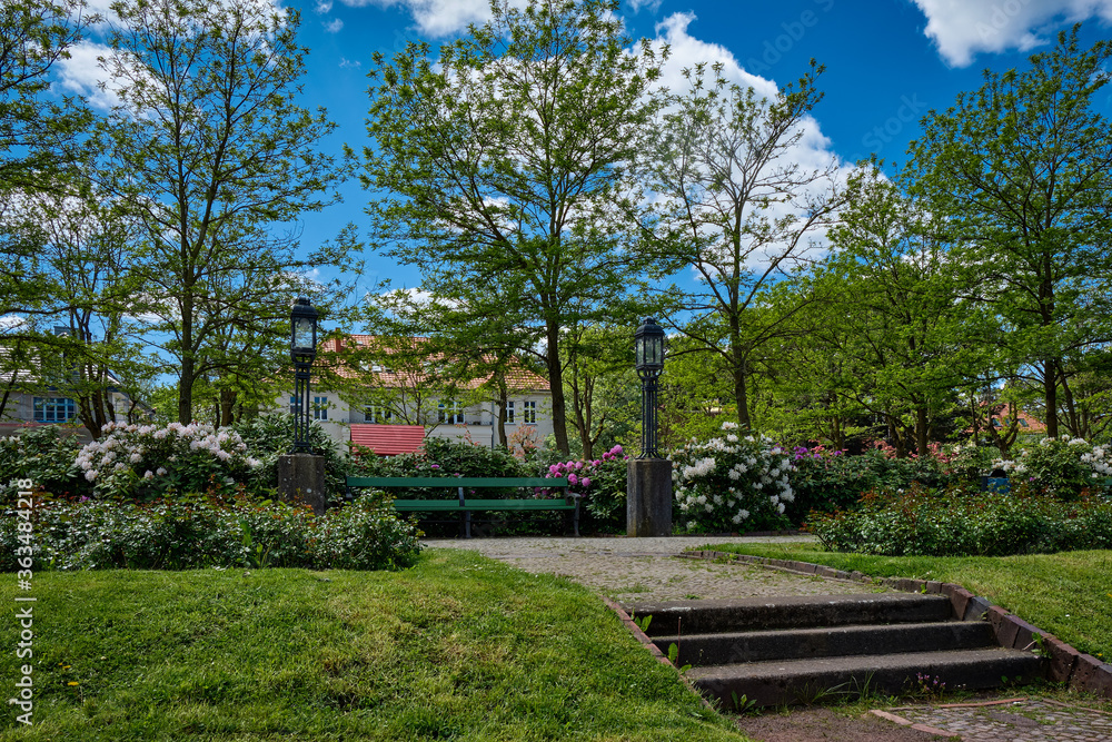 Fotografie Von Kandelabern flankierte Ruhebank auf dem frühlingshaften Karolingerplatz im B