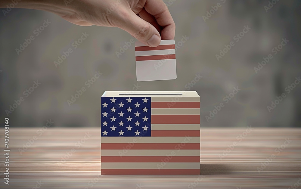 Fotografie Voting process with a hand placing a card into a box with an American flag desig