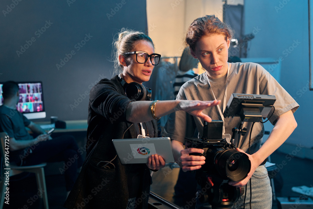 Obraz na plátně Waist up portrait of female director giving instructions working in video produc