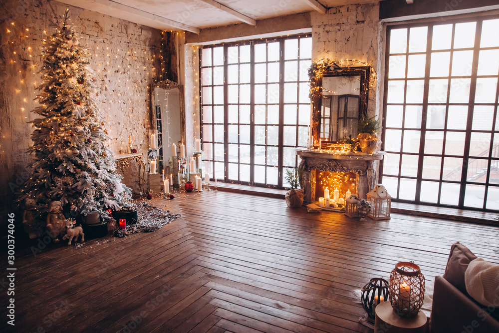 Fotografie warm cozy evening luxury Christmas room interior design, Xmas tree decorated by gold lights presents gifts, candles,mirror garland lighting fireplace