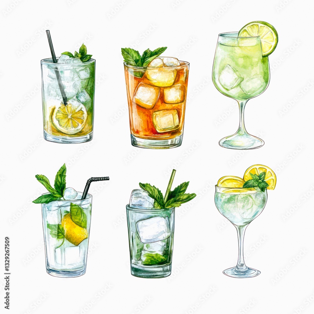 Fotografie Watercolor clip art of assortment of alcohol cocktails isolated on white background