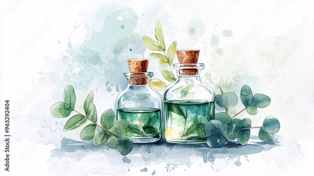 Fotografie Watercolor Eucalyptus Essential Oil Bottles