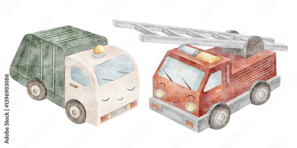 Fotografie Watercolor illustration city cars, fire engine, garbage truck Isolate transport