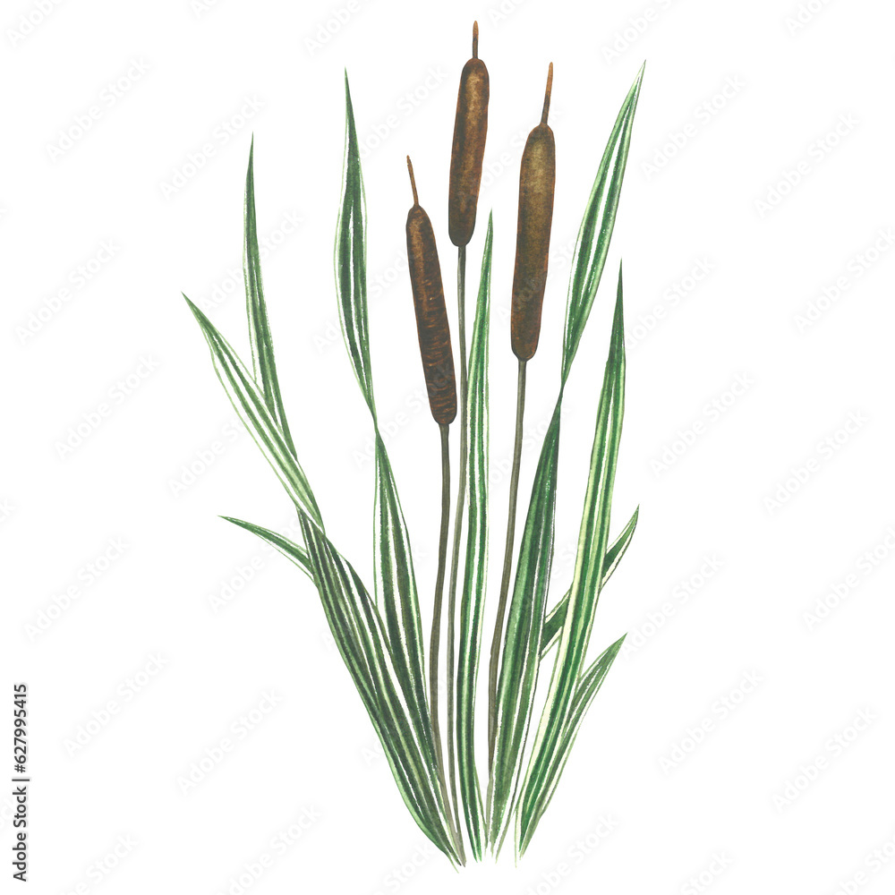 Fotografie Watercolor illustration of cattail isolated on transparent background made by ha
