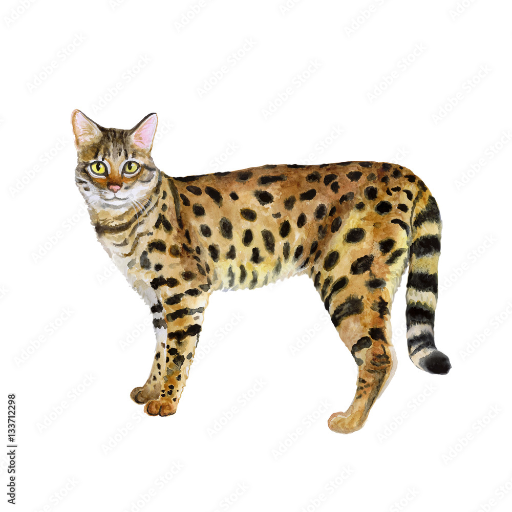 Obraz na plátně Watercolor portrait of Safari cute wild cat with dots, stripes isolated on white background