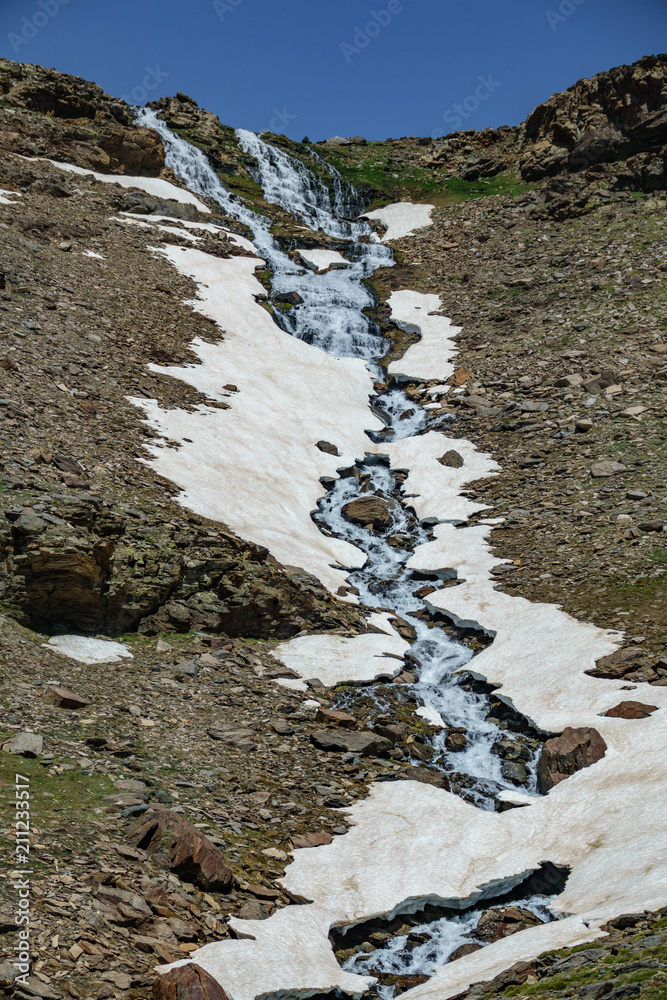 Fotografie Waterfall with ice and snowfields, vertical composition