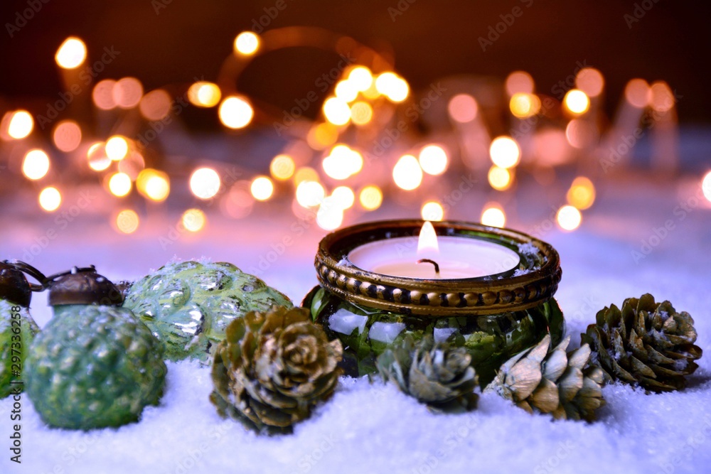 Fotografie Weihnachtsdekoration mit Kerze und Lichterkette im Schnee - Grußkarte