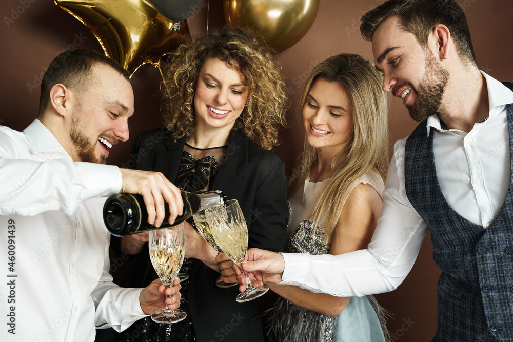 Fotografie Well dressed party people celebrating holiday or event and drinking sparkling w