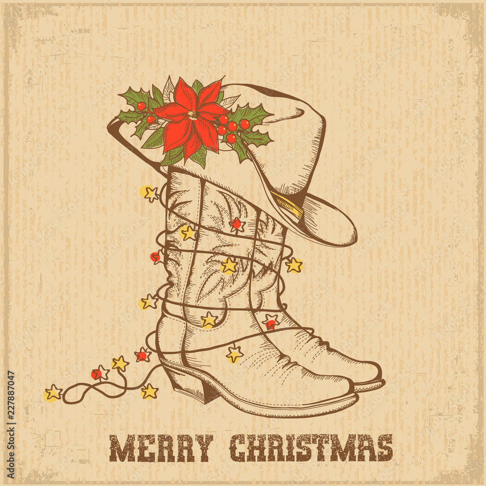 Fotografie Western Christmas greeting card with cowboy traditional boots and cowboy hat