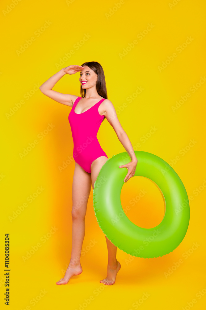 Fotografie Where is my vacation Full-legh vertical portrait of excited girl in a colorful s