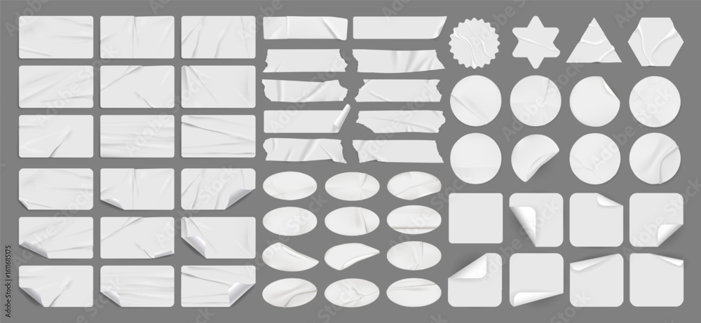 Fotografie White adhesive paper sticker label, tag and plastic tape collection with peeling corner and shadow