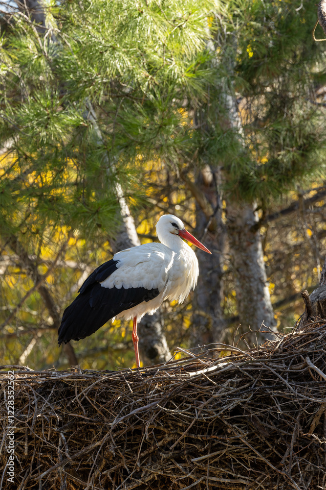 Fotografie White Stork (Ciconia ciconia), commonly found in Europe, Africa, and Asia, spotted in Casa de Campo