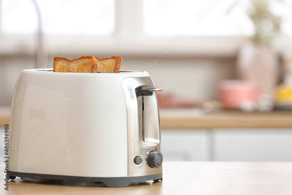Fotografie White toaster with bread slices on counter in modern kitchen