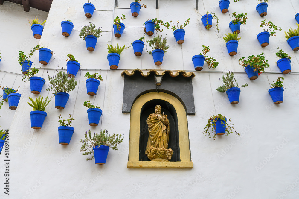 Fotografie White wall decorated with blue flower pots at traditional Spanish Village Poble