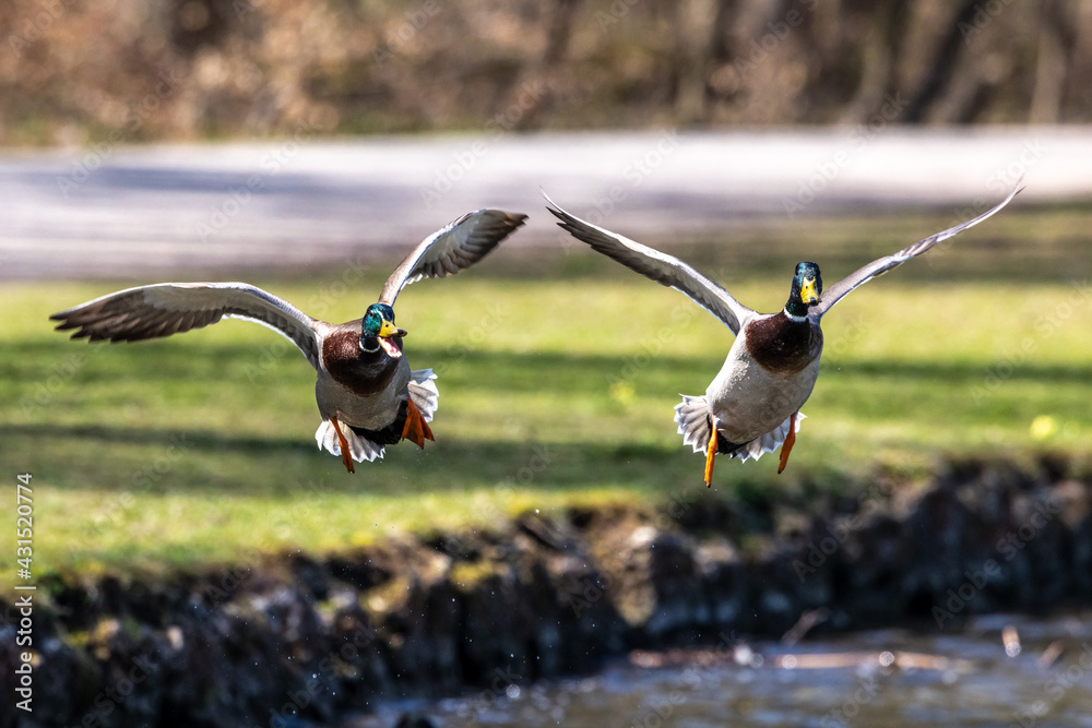 Obraz na plátně Wild duck or mallard, Anas platyrhynchos flying over a lake in Munich, Germany