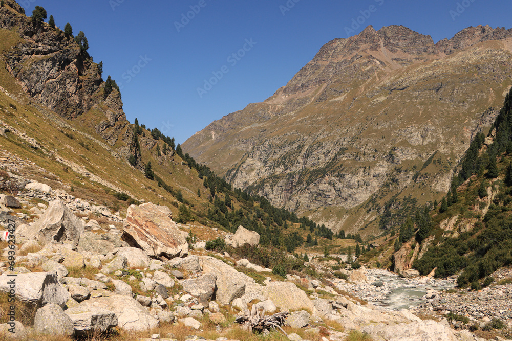 Fotografie Wildromantische Alpenlandschaft des Bergell; Val Forno mit Gletscherbach und Piz