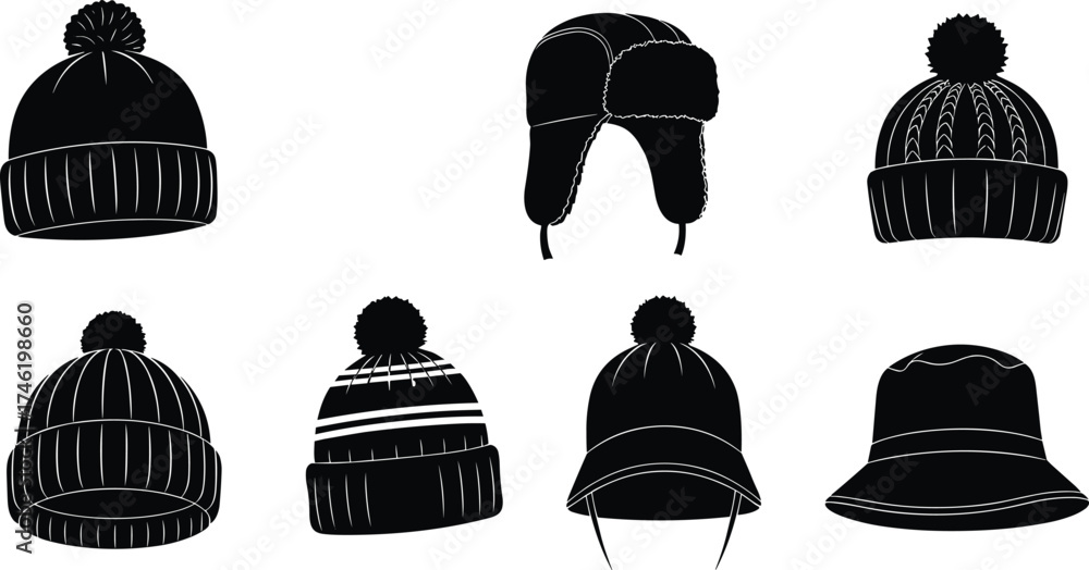Fotografie Winter hat silhouette set, black and white headwear illustrations, festive beani