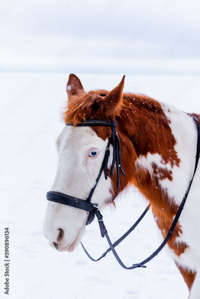 Obraz na plátně Winter portrait of a beautiful white and brown horse with blue eyes standing on the ice of a frozen lake