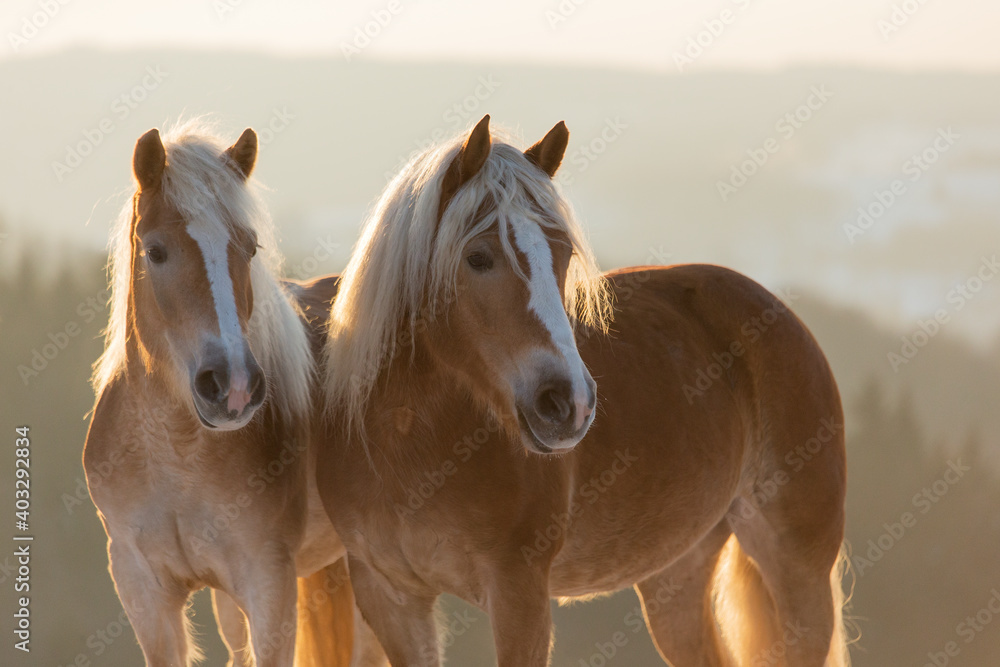Fotografie Witer portrait of Haflinger horses in backlight