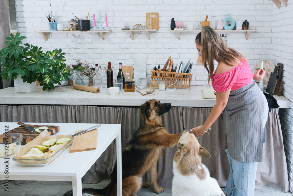 Obraz na plátně woman baking pears with ricotta and walnuts, and playing with dogs