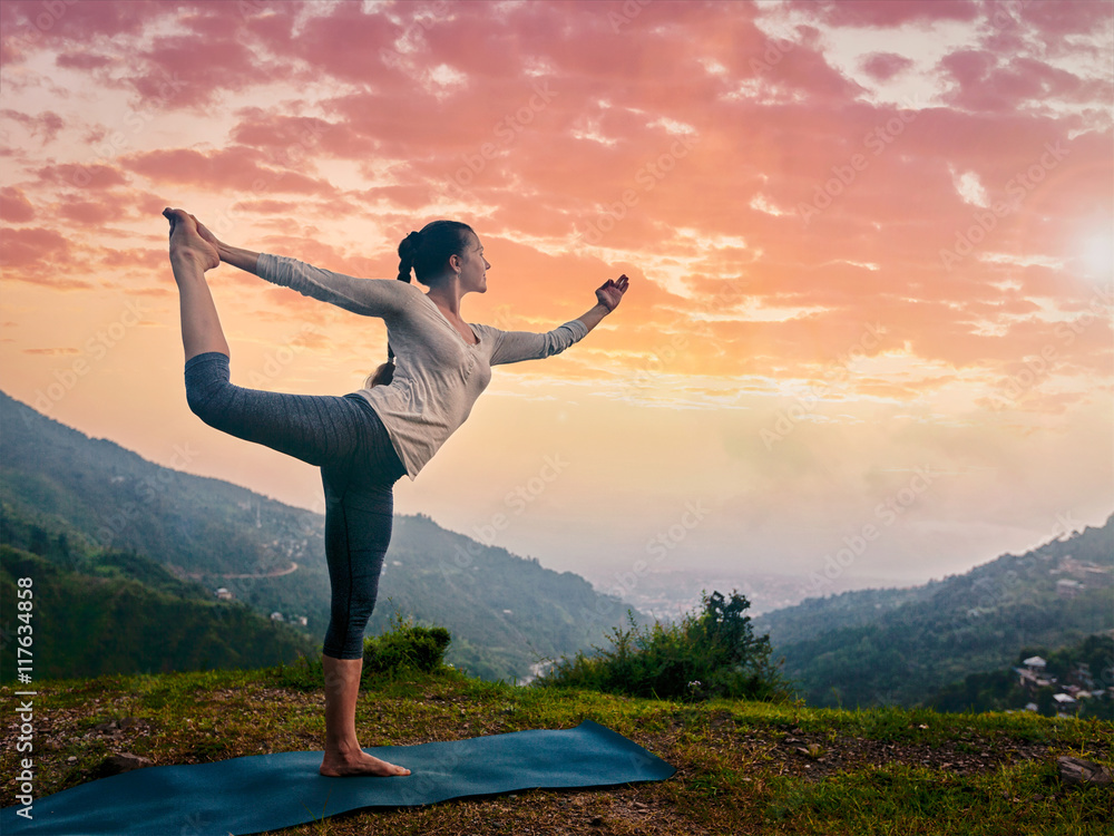 Fotografie Woman doing yoga asana Natarajasana outdoors at waterfall
