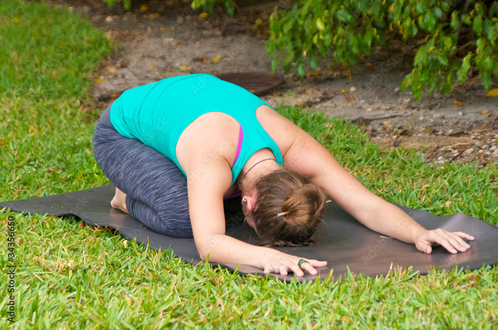 Fotografie woman doing Yoga posture Balasana or childs pose outdoors on gra