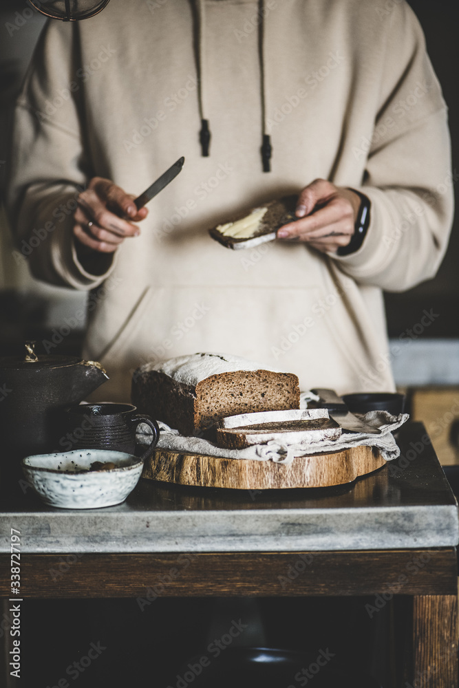 Fotografie Woman having breakfast and spreading butter to healthy rye Swedish bread slice c