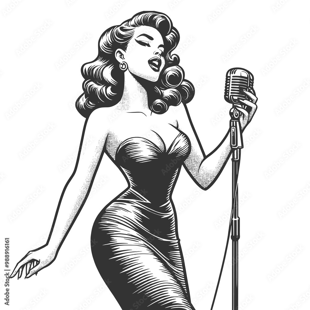 Fotografie woman in a tight evening dress singer holding a microphone the classic style sketch engraving generative ai fictional character raster illustration