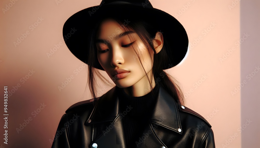 Fotografie Woman in Black Leather Jacket and Hat Pink Background