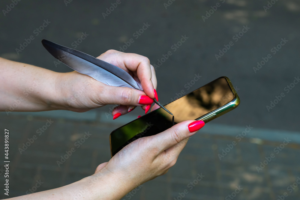 Fotografie Woman tries to use a bird pen for smartphone.