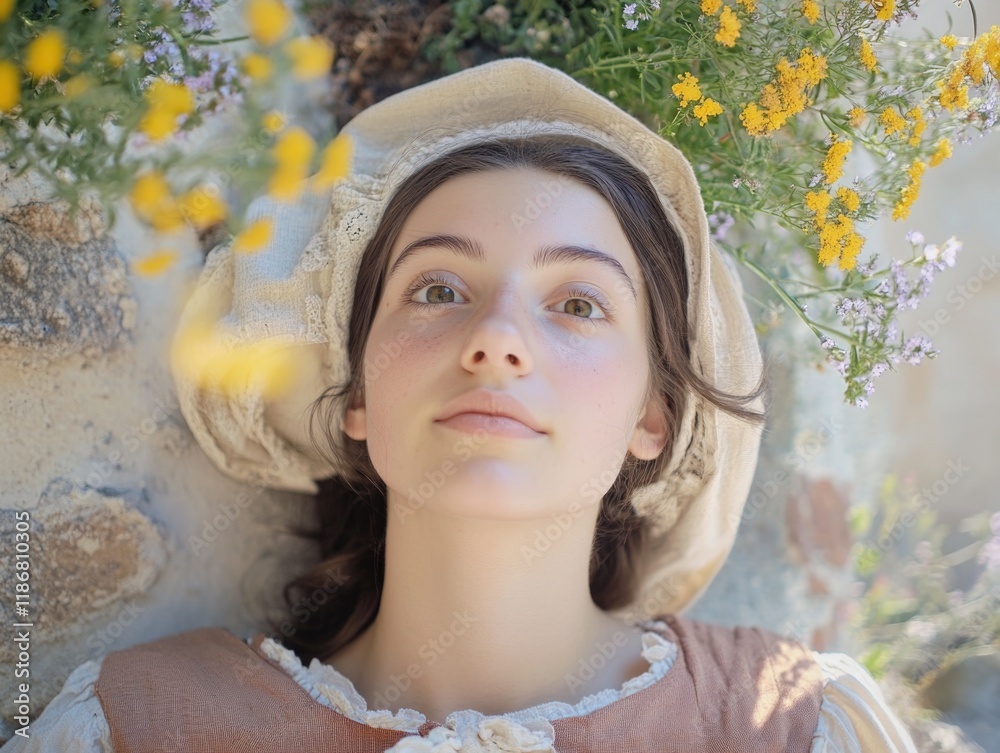 Fotografie Woman wearing a white hat and a brown vest is laying on the ground