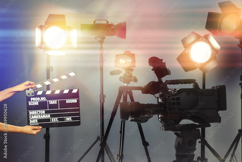 Obraz na plátně Woman with clapperboard near modern professional video camera in studio, closeup