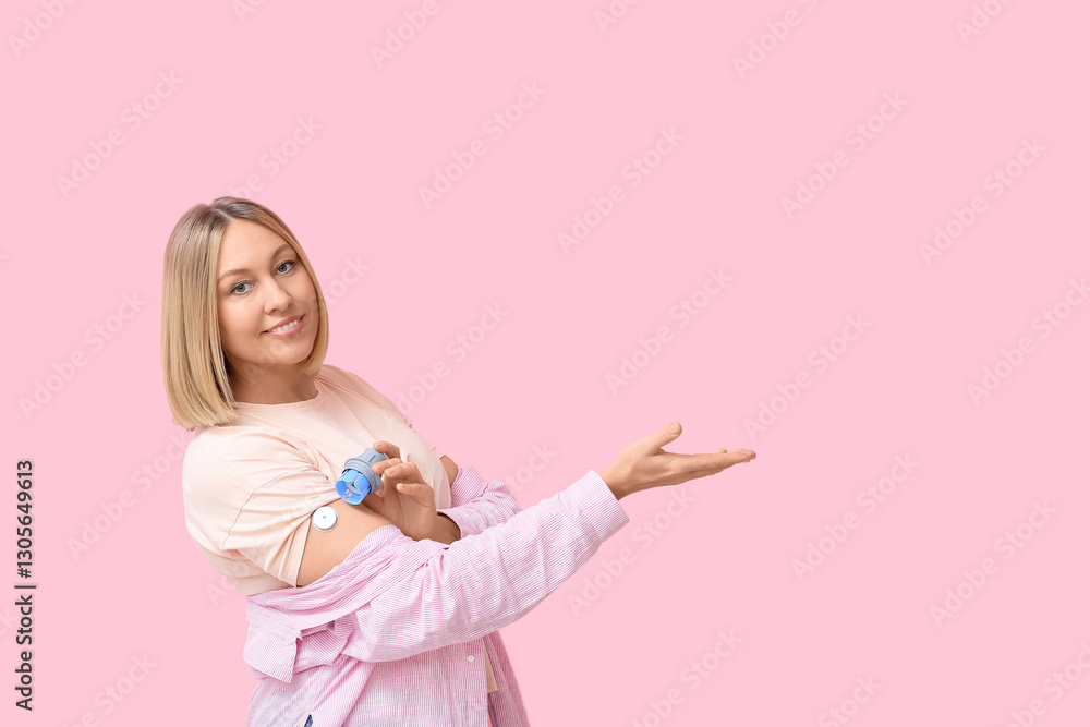 Fotografie Woman with glucose sensor for measuring blood sugar level and applicator showing something on pink background