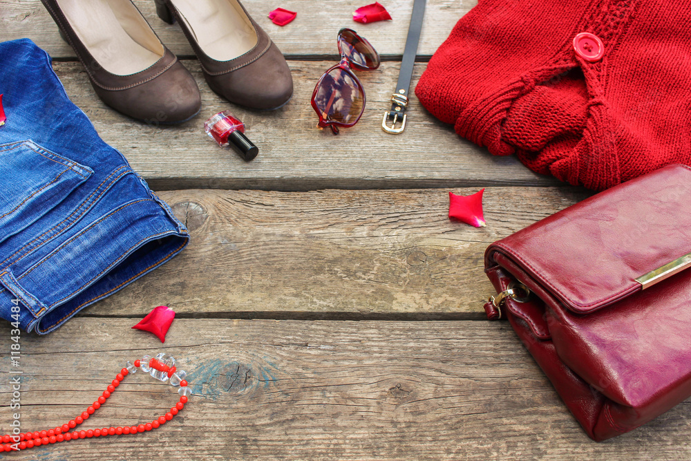 Fotografie Women's autumn clothing and accessories: red sweater, jeans, handbag, beads, sunglasses, nail polish, shoes, belt on wooden background