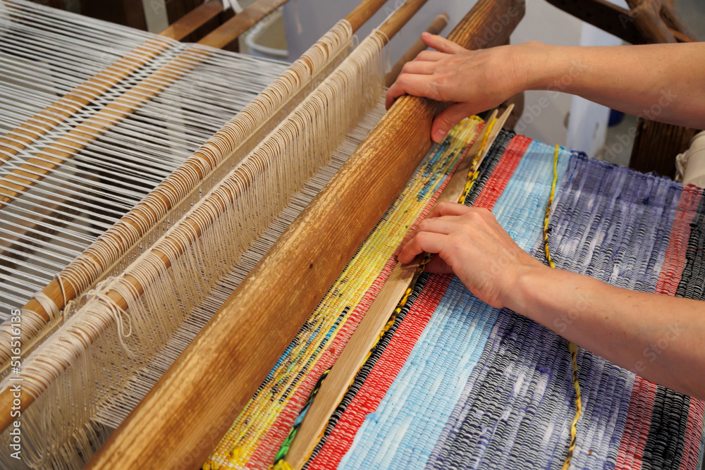 Obraz na plátně Women's hands weave a canvas on a retro loom close-up.