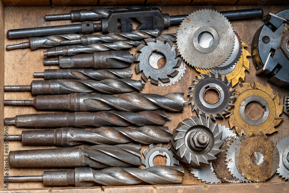 Fotografie Wooden tool box of tools with old and dirty, rusty drills and saw blades, closeu