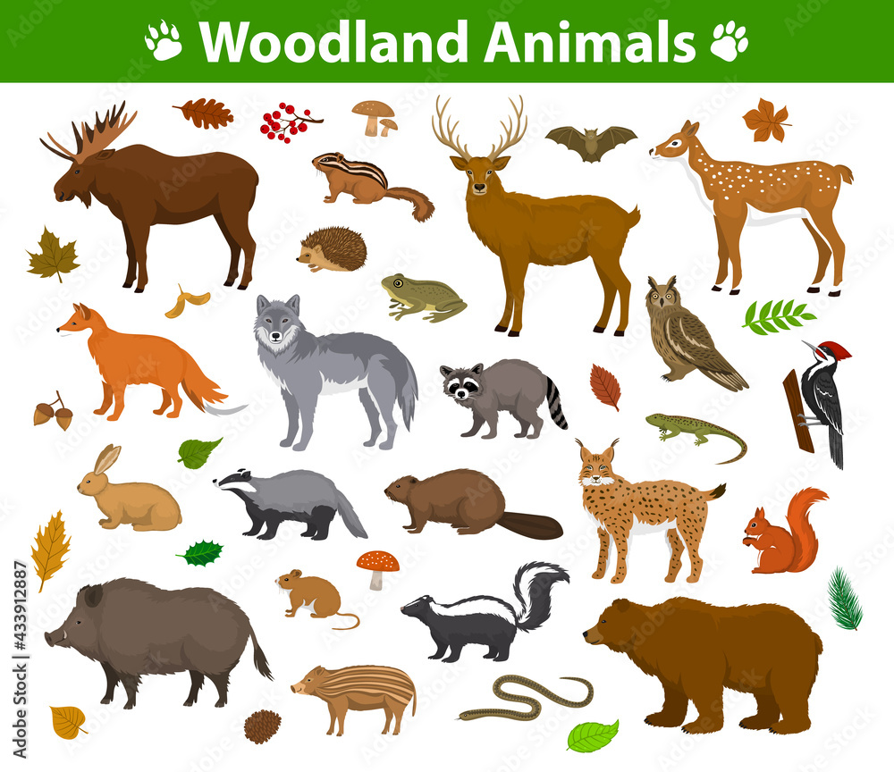 Fotografie Woodland forest animals collection including deer, bear, owl, wild boar, lynx,