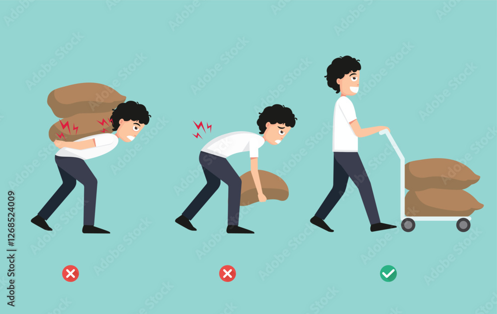 Obraz na plátně wrong and right carrying position ,Improper versus against proper lifting ,body