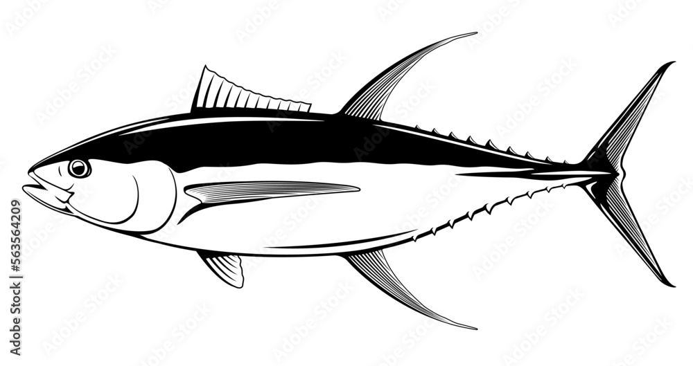 Obraz na plátně Yellowfin tuna fish in side view in black and white isolated illustration, reali