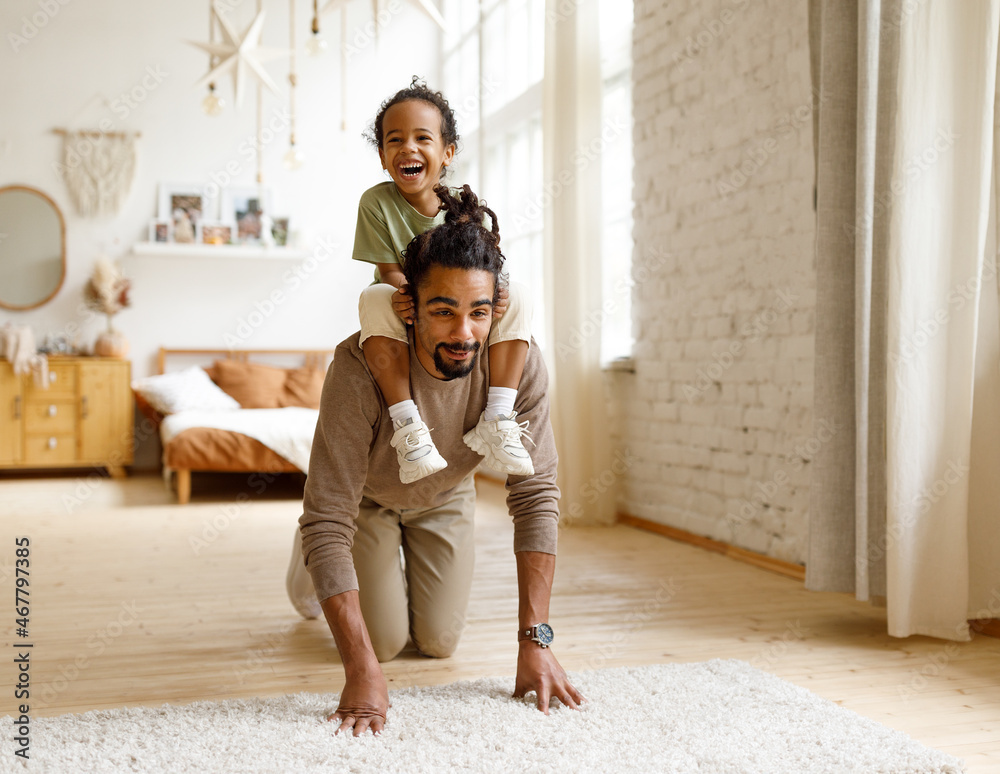 Obraz na plátně Young african american father giving piggyback ride to little son during playtim