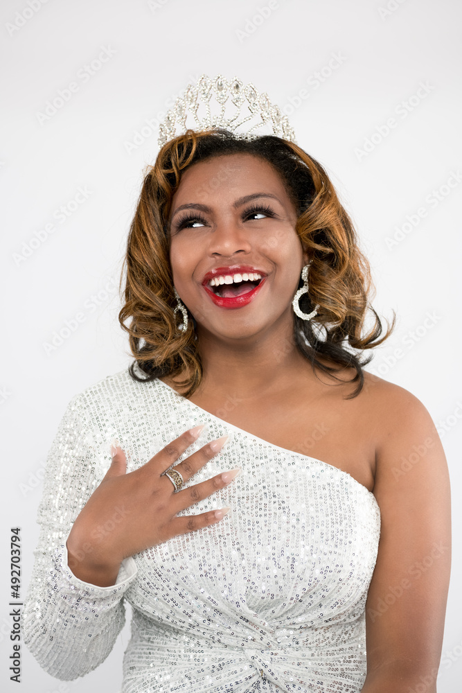 Fotografie Young African-American Woman Wearing a Crown in a White Dress