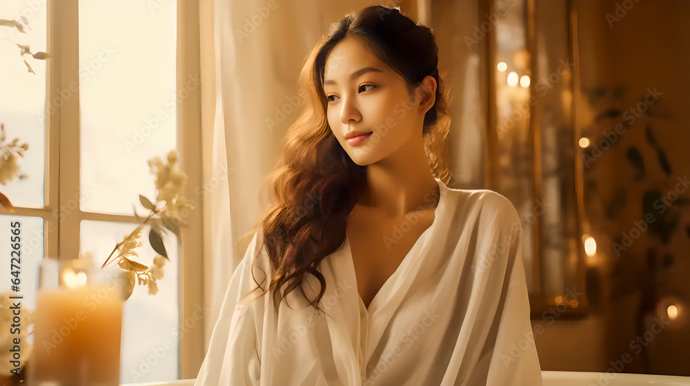 Fotografie Young beautiful Asian girl in the bathroom happy relieves stress and strengthens
