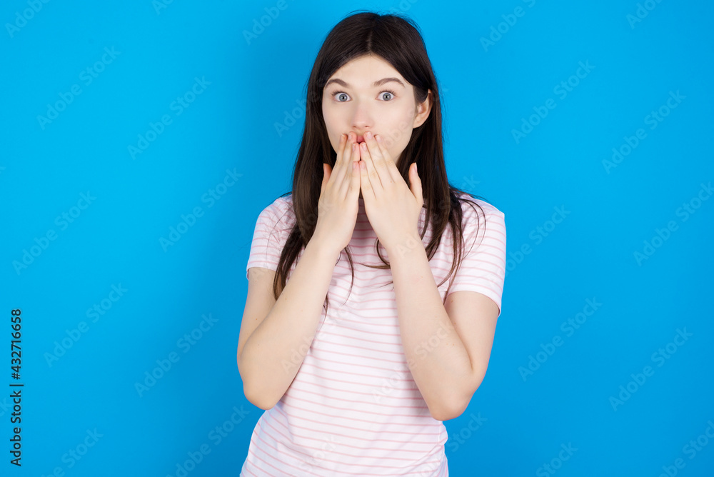 Fotografie young beautiful Caucasian woman wearing stripped T-shirt over blue wall keeps ha