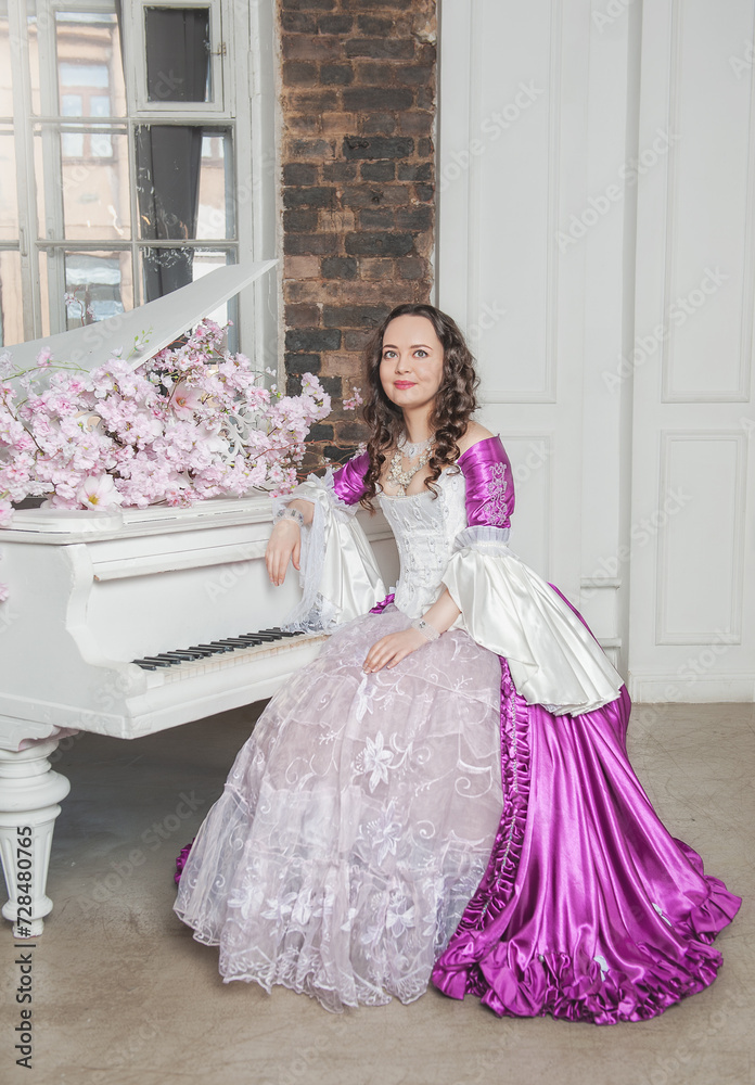 Fotografie Young beautiful woman in fantasy rococo style medieval dress sitting near piano